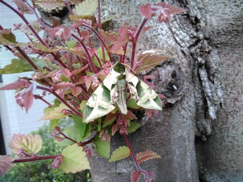 ある日の夕方 義母の薬を診療所に取りに行き 帰宅した ふと助手席を見る いつの間に入り込んだのか 美しい珍客がいた 初めて見る「蛾」だ 帰宅するまで気付かなかった訪問者 一瞬チェック柄に見えたが 波のような流れる曲線 なんて素敵な 色とデザインだろう…